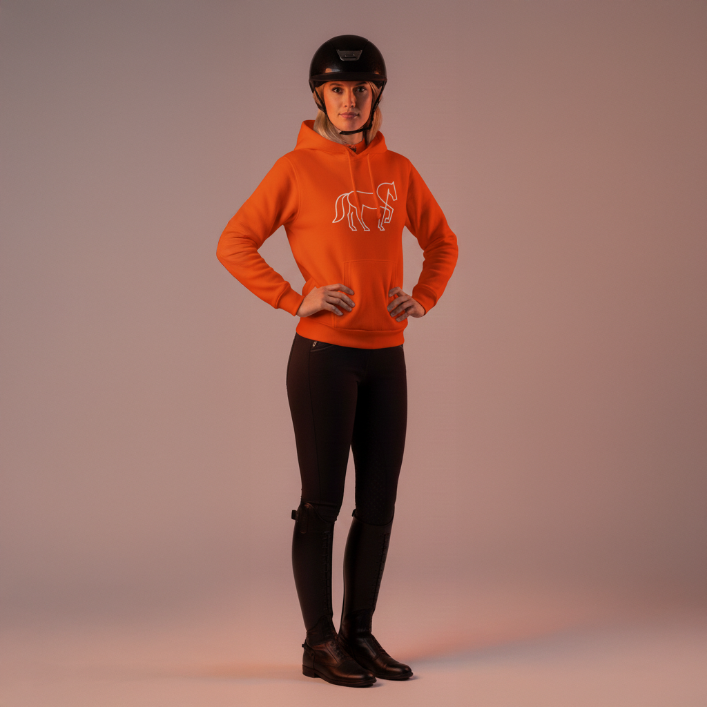 Kraftvoll. Klar. Unübersehbar. Der Bold Hoodie bringt deine Pferdeliebe in einem minimalistischen, starken Design zum Ausdruck. Das markante Linienpferd trifft auf knalliges Orange – ein Statement, das Selbstbewusstsein und Energie ausstrahlt.
